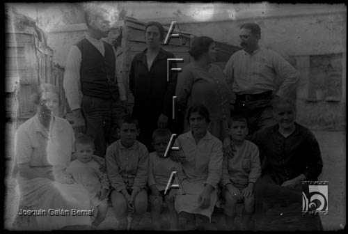 Grupo de hombres, mujeres y niños en un corral. Joaquín Galán Bernal. Huesca
