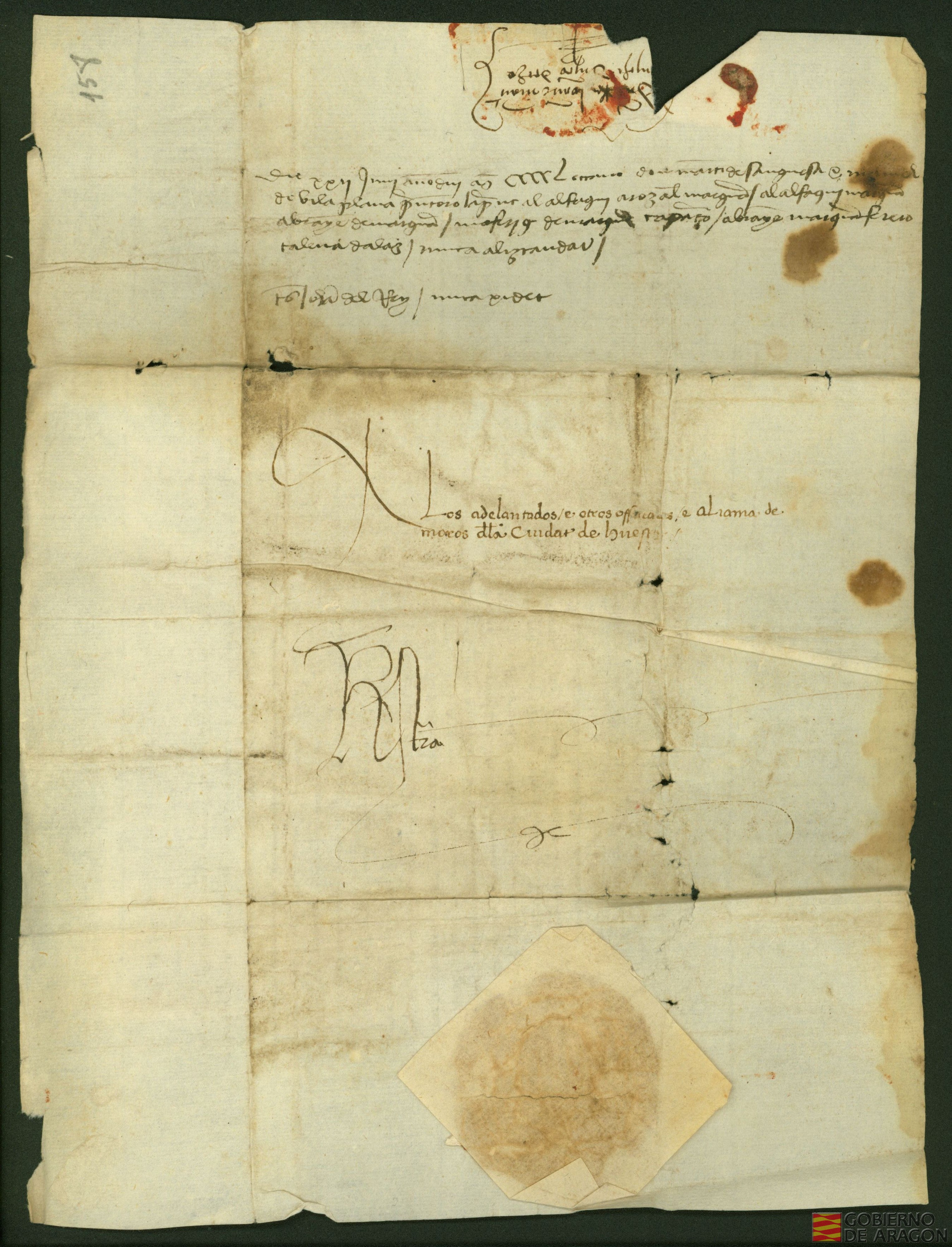 Juan II, rey de Aragón, escribe a la aljama de moros de Huesca para que paguen a Manuel de Vilaplana, mercader de Lérida, los 100 florines de oro que había tenido que pagar por unos unos moros de dicha aljama que él había asegurado y se escaparon de la prisión.
