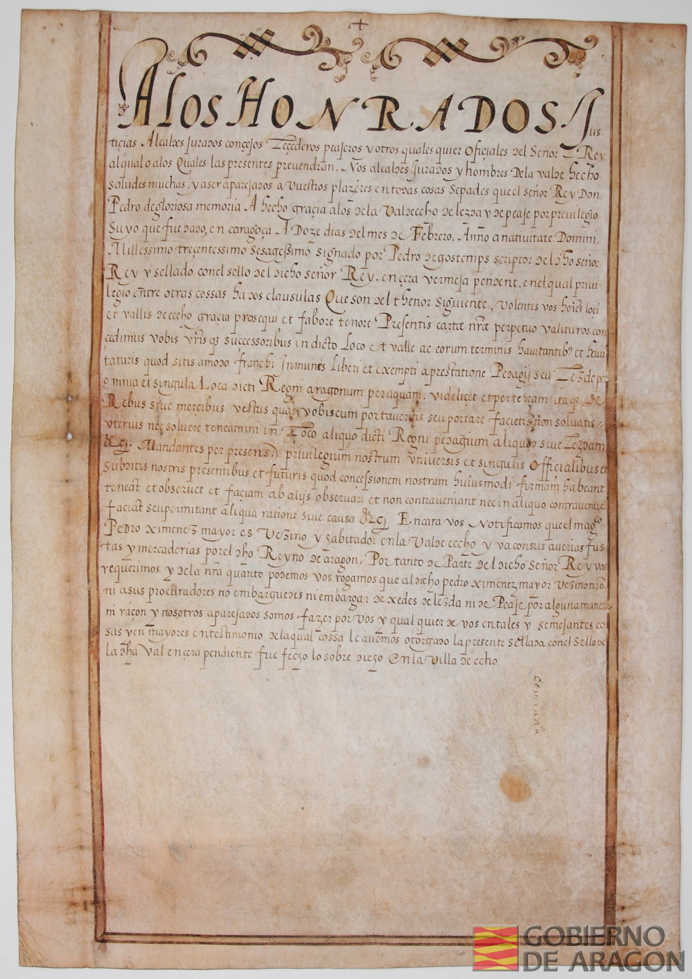 El concejo del valle de Echo notifica a todos los oficiales del rey que el rey Pedro IV les concedió un privilegio el 12 de febrero de 1360 por el que se hacía inmunes del pago de lezdas en todo el reino de Aragón a los vecinos del valle.