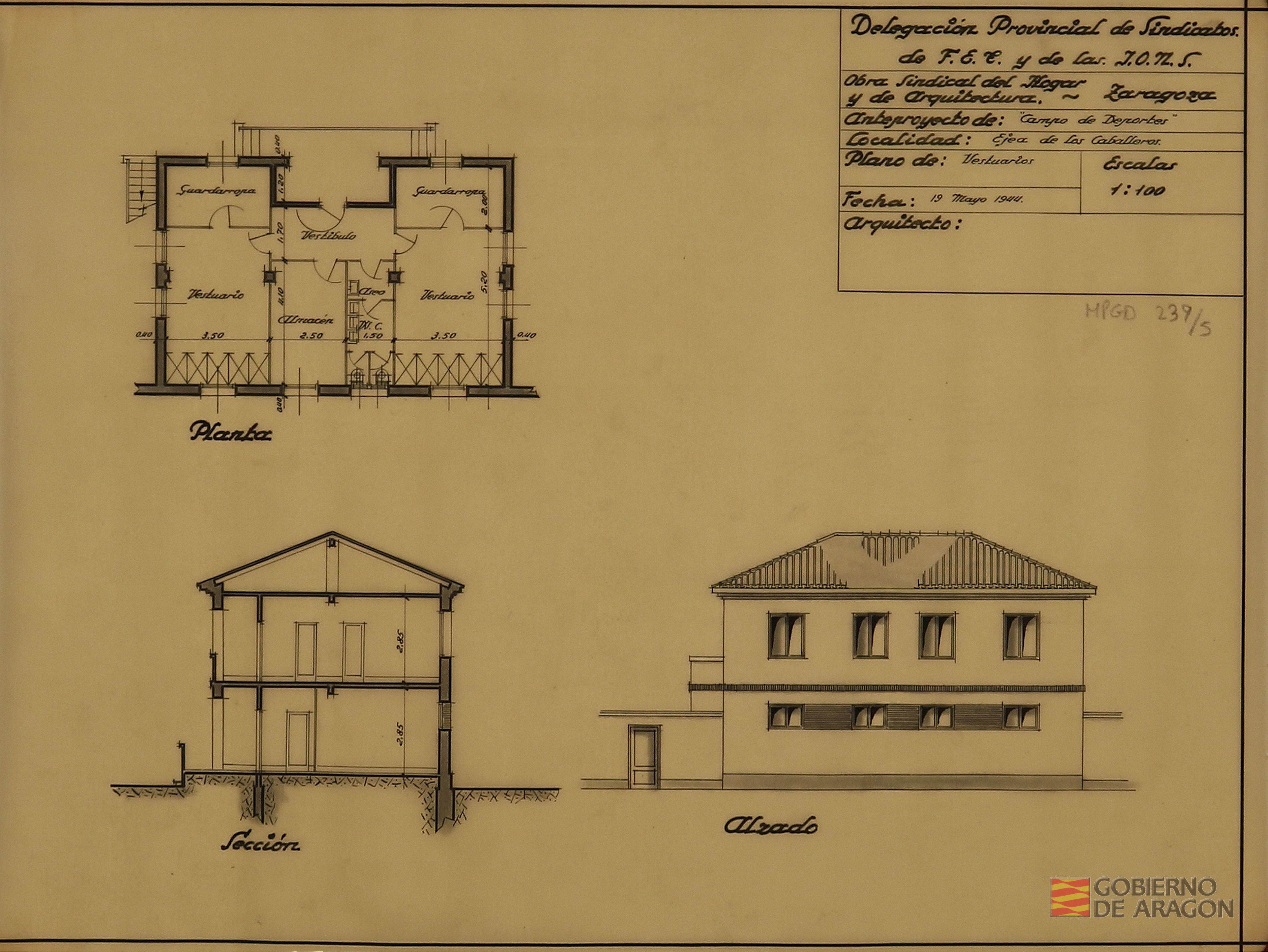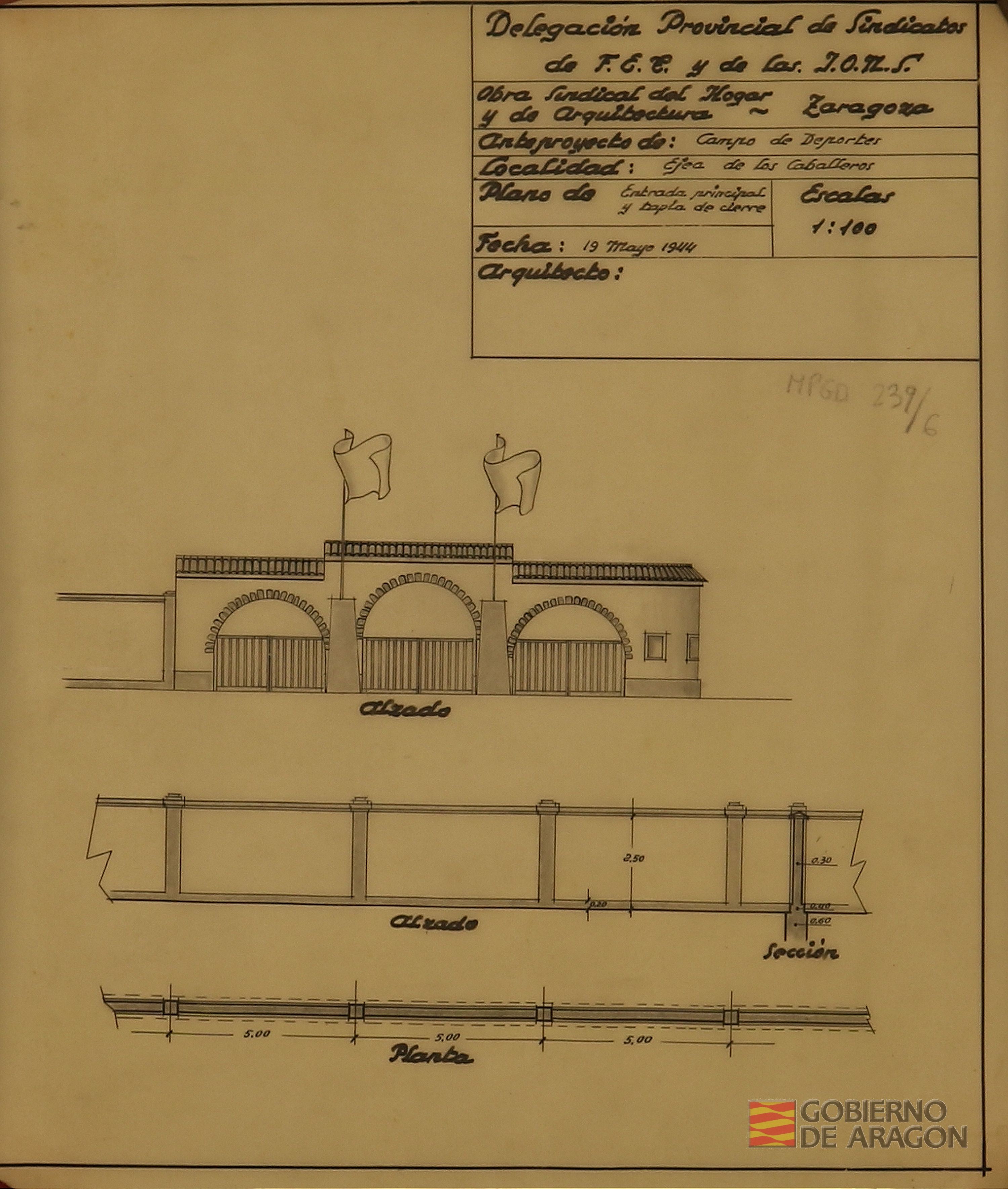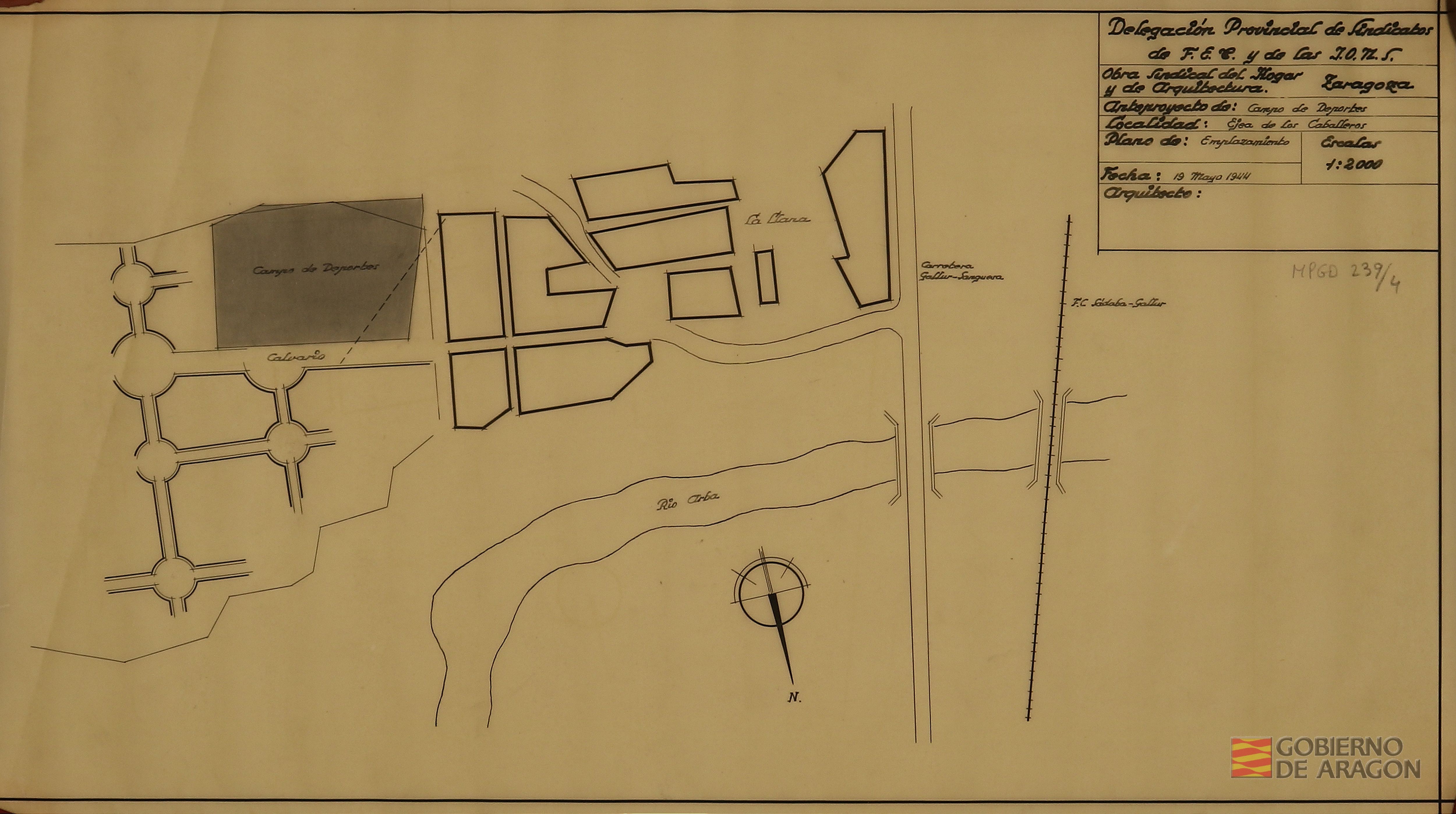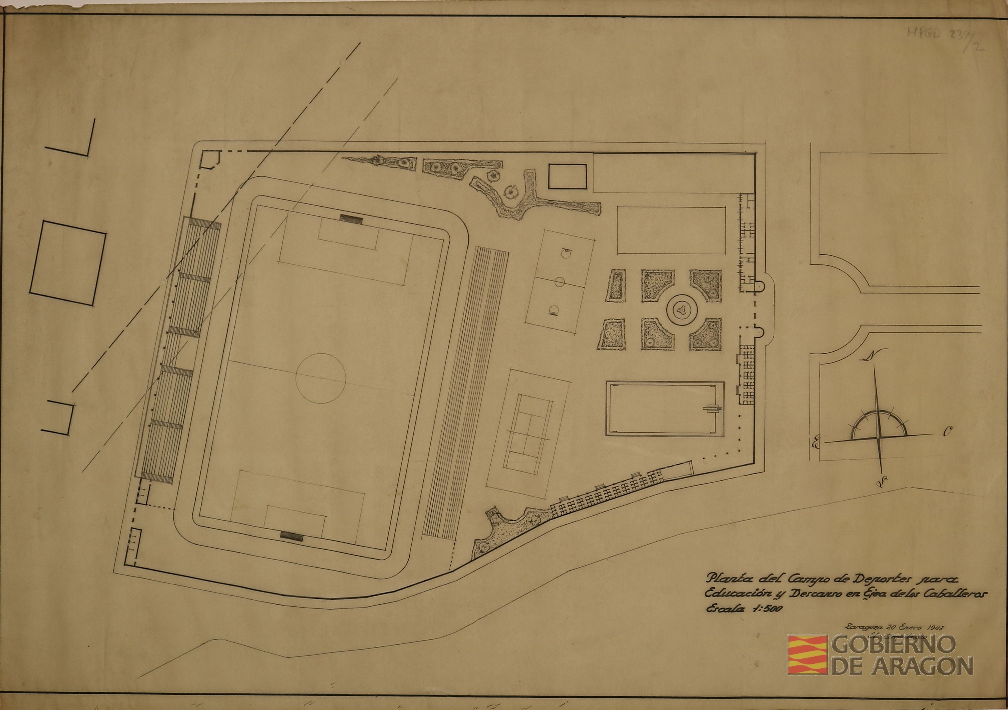 Planta del Campo de deportes de la Obra Sindical de Educación y Descanso en Ejea de los Caballeros