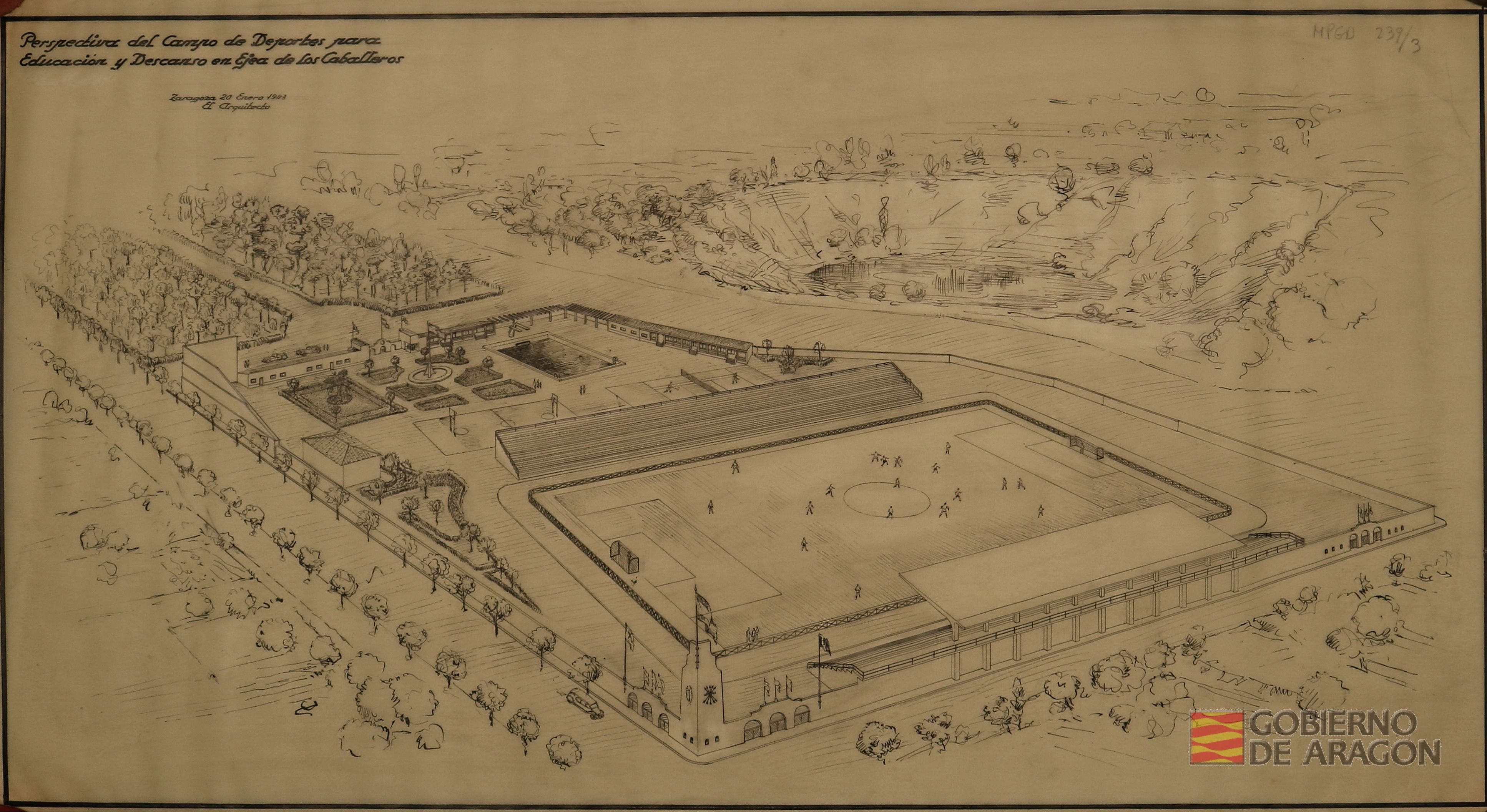 Perspectiva del Campo de deportes de la Obra Sindical de Educación y Descanso en Ejea de los Caballeros