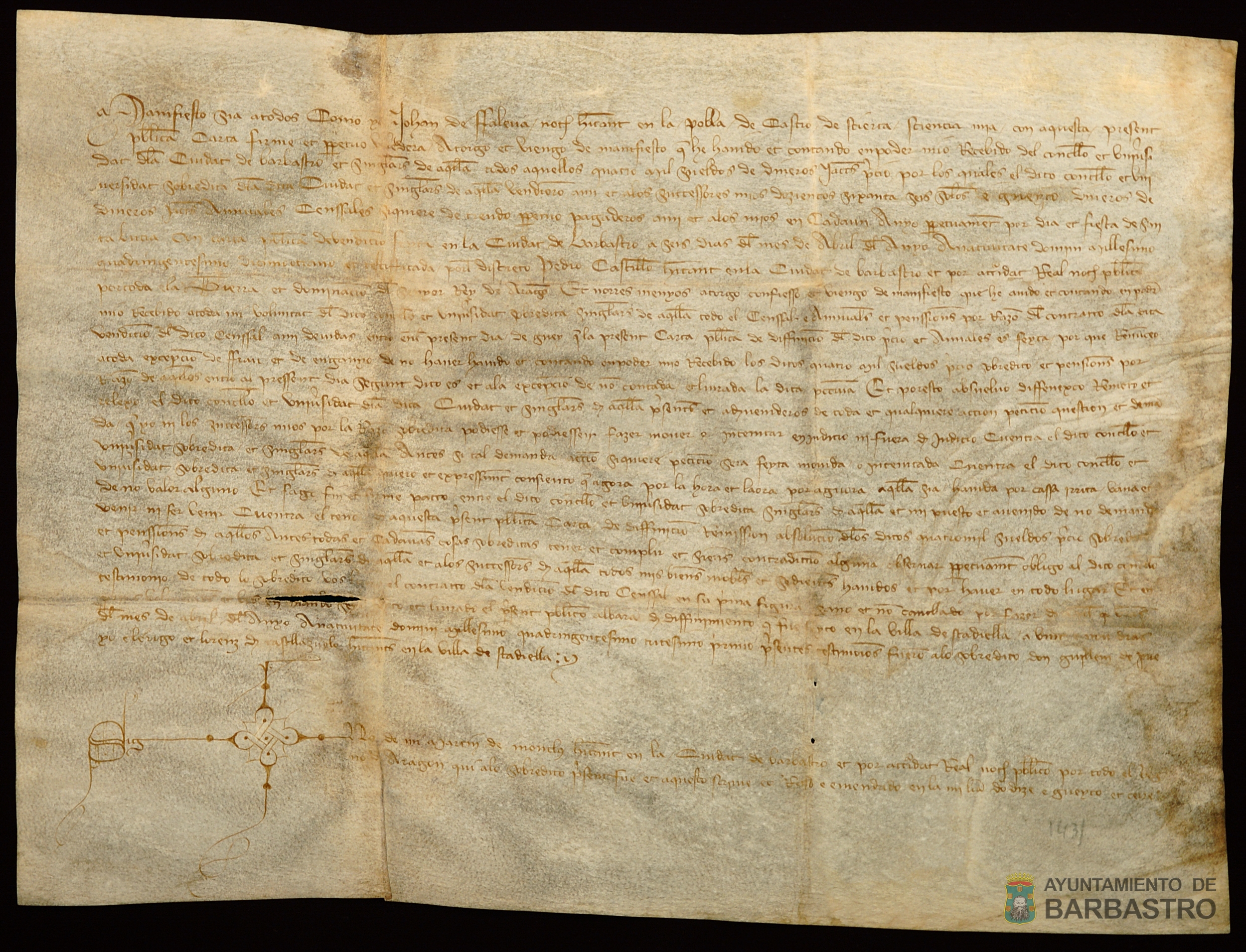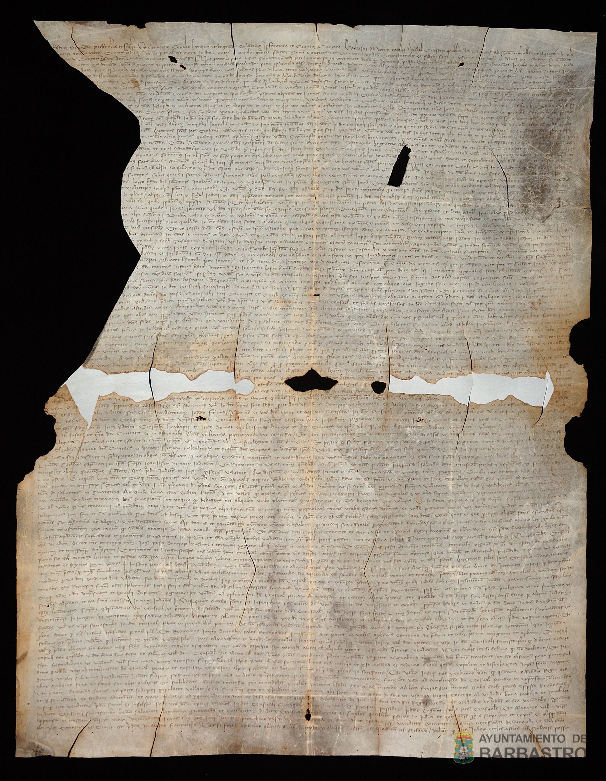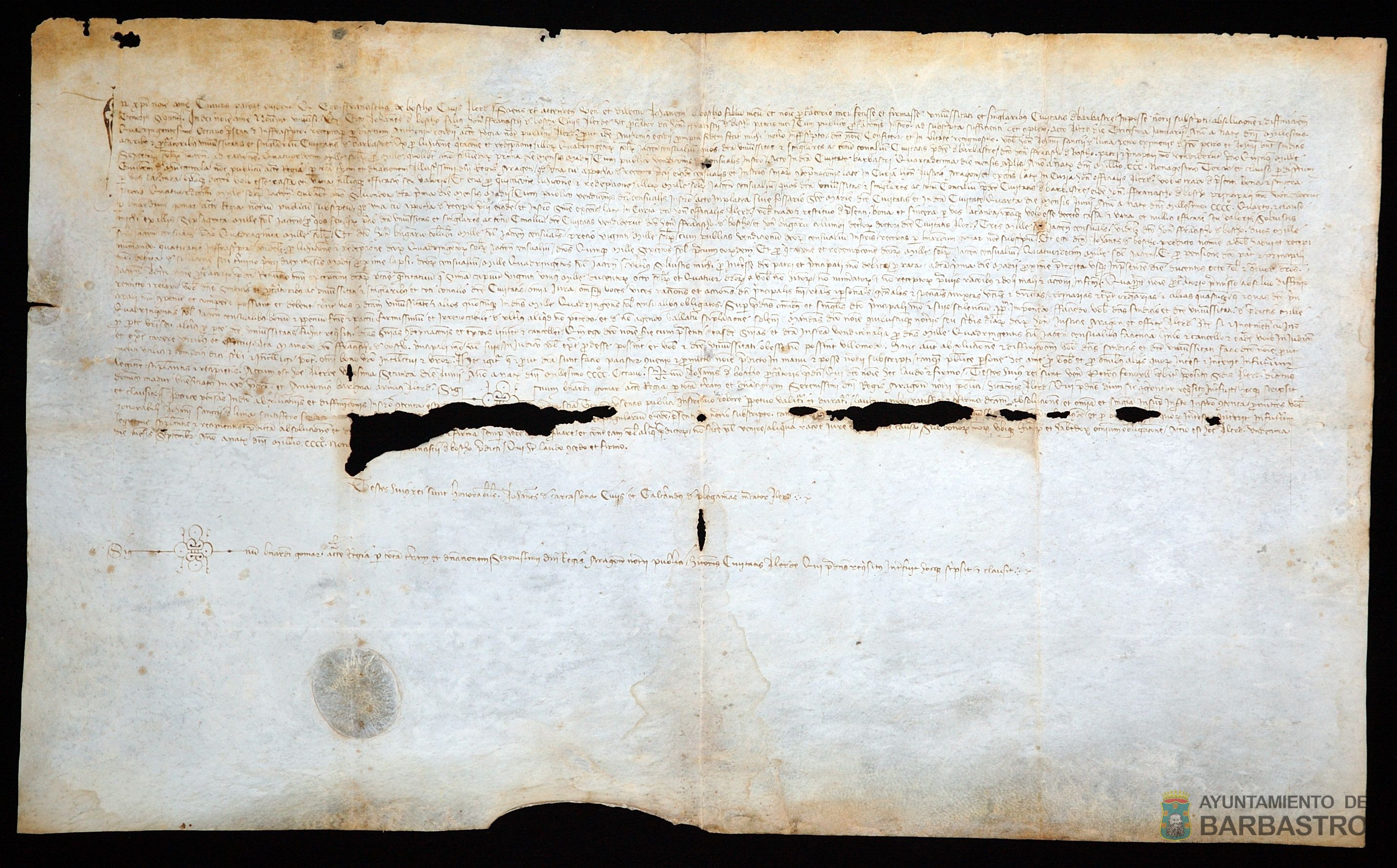 Luis y Antonio de Santangel, vecinos de Barbastro, como herederos de su padre Pedro de Santangel reciben del Concejo de Barbastro los 2000 sueldos jaqueses de propiedad de un censo de 133 sueldos y 4 dineros jaqueses vendido por el Concejo a Juan Bernat